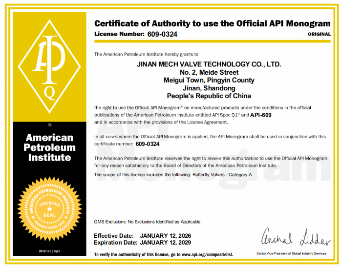 2026年1月12日,玫德集团迎来发展史上的重要里程碑——旗下阀门产品历经严苛审核,正式通过美国石油协会(American Petroleum Institute,简称API)权威认证,成功斩获API 6D与API 609两项核心资质!这一成果标志着玫德集团在能源装备领域的技术实力与质量管理体系全面达到国际顶尖标准,不仅填补了集团在高端阀门国际认证领域的重要空白,更成功拿到了进入全球石油天然气高端供应链的“国际通行证”,向世界级综合能源装备服务商迈出了关键一步。